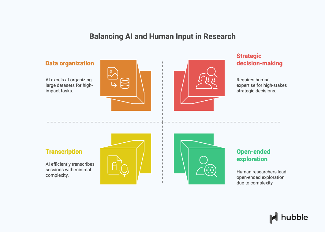 Human researchers bring judgment and intentional oversight. They validate AI-generated outputs, recognize when results feel off, and contextualize findings within the realities of user behavior and business goals. Rather than accepting AI output at face value, humans interpret, challenge, and refine it.