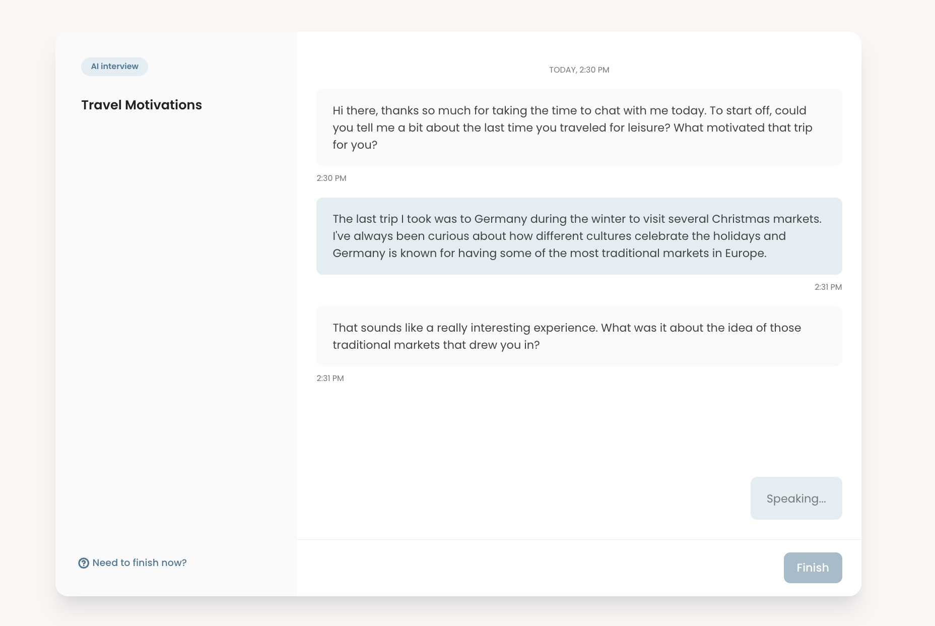 AI can make data collection feel faster and more scalable. The risk is assuming that structured transcripts or AI-led conversations are equivalent to deeply observed research. Text alone does not capture the full richness of human behavior.